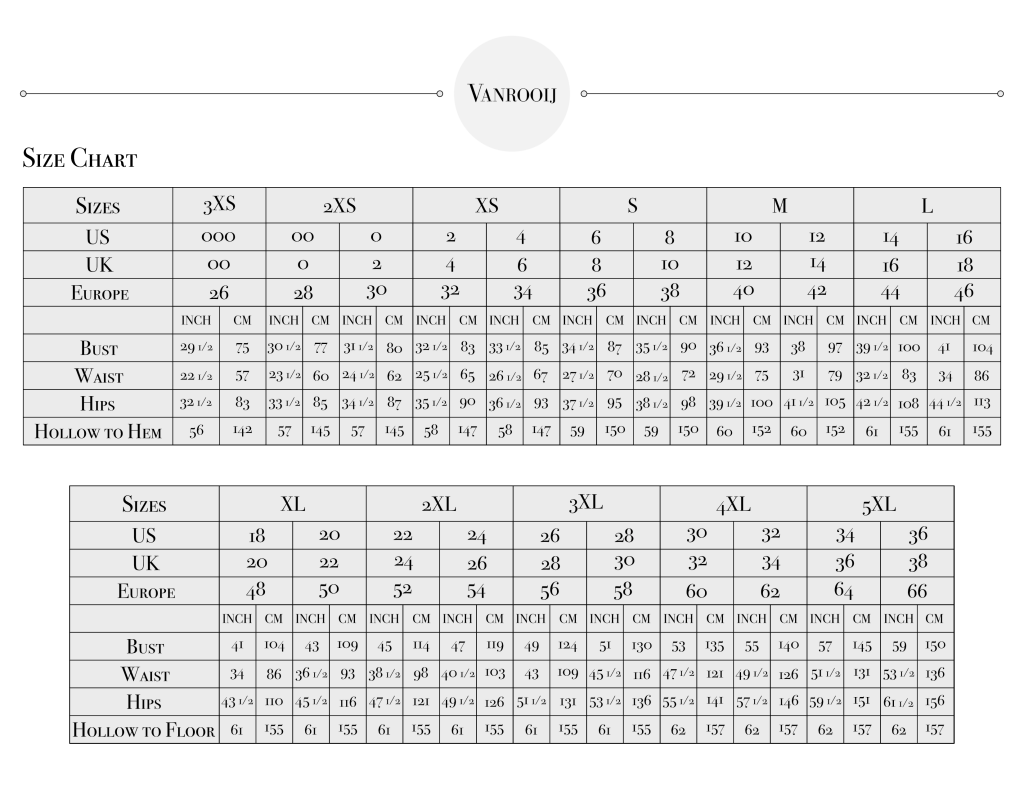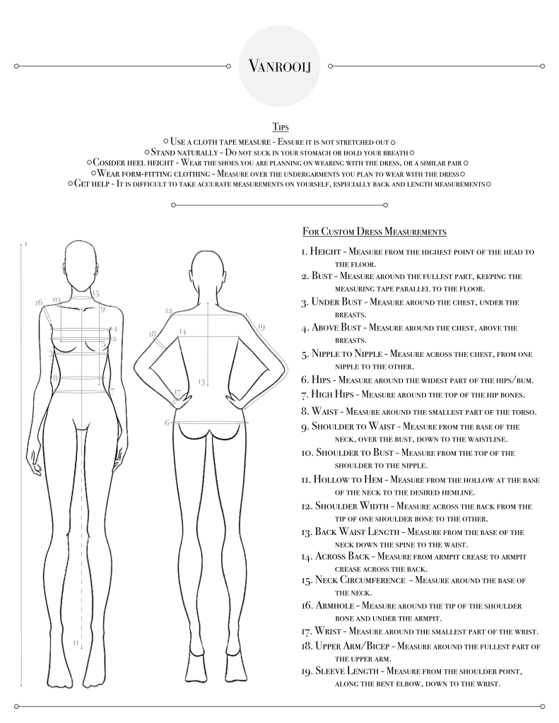 At Vanrooij Designs we want to ensure the perfect fit. Both a general size chart and a guide to finding your exact measurements is provided below. Providing your exact measurements is important for custom dress sizing because all bodies are different from head to toe.
